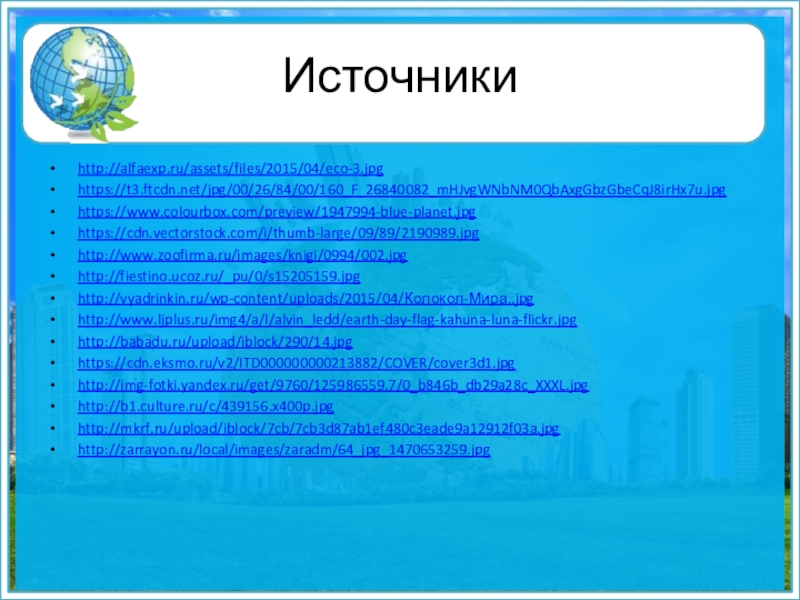Источникиhttp://alfaexp.ru/assets/files/2015/04/eco-3.jpghttps://t3.ftcdn.net/jpg/00/26/84/00/160_F_26840082_mHJvgWNbNM0QbAxgGbzGbeCqJ8irHx7u.jpghttps://www.colourbox.com/preview/1947994-blue-planet.jpghttps://cdn.vectorstock.com/i/thumb-large/09/89/2190989.jpghttp://www.zoofirma.ru/images/knigi/0994/002.jpghttp://fiestino.ucoz.ru/_pu/0/s15205159.jpghttp://vyadrinkin.ru/wp-content/uploads/2015/04/Колокол-Мира..jpghttp://www.ljplus.ru/img4/a/l/alvin_ledd/earth-day-flag-kahuna-luna-flickr.jpghttp://babadu.ru/upload/iblock/290/14.jpghttps://cdn.eksmo.ru/v2/ITD000000000213882/COVER/cover3d1.jpghttp://img-fotki.yandex.ru/get/9760/125986559.7/0_b846b_db29a28c_XXXL.jpghttp://b1.culture.ru/c/439156.x400p.jpghttp://mkrf.ru/upload/iblock/7cb/7cb3d87ab1ef480c3eade9a12912f03a.jpghttp://zarrayon.ru/local/images/zaradm/64_jpg_1470653259.jpg