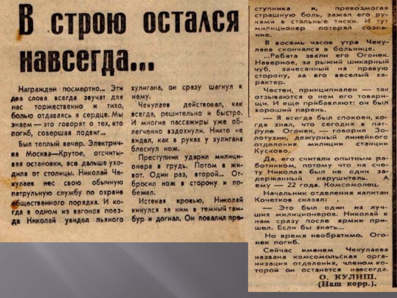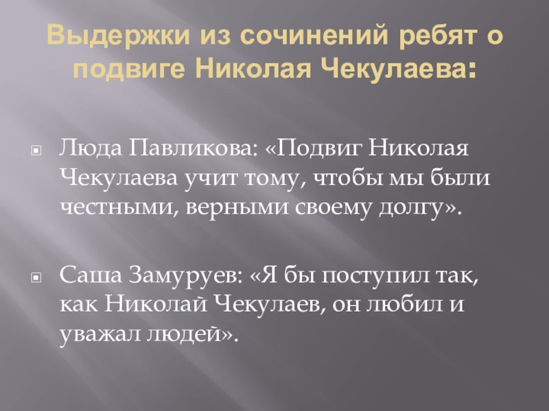 Выдержки из сочинений ребят о подвиге Николая Чекулаева: Люда Павликова: «Подвиг Николая Чекулаева учит тому, чтобы