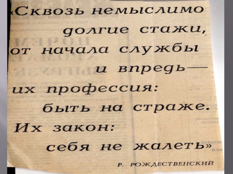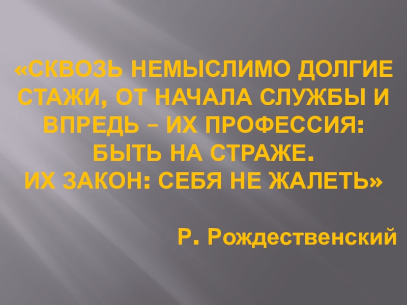 ПРОФЕССИЯ: БЫТЬ НА СТРАЖЕ. ИХ ЗАКОН: СЕБЯ НЕ ЖАЛЕТЬ» Р. Рождественский