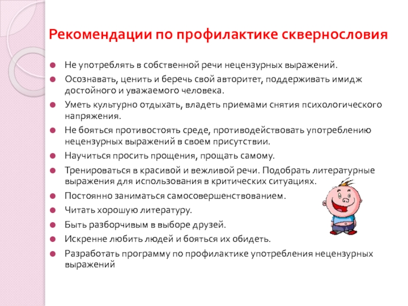 Не бояться противостоять среде, противодействовать употреблению нецензурных выражений в своем присутствии.