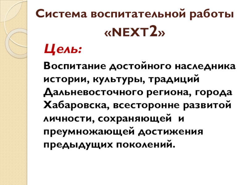 Система воспитательной работы «NEXT2»Цель: Воспитание достойного наследника истории, культуры, традиций Дальневосточного региона, города Хабаровска, всесторонне развитой личности, сохраняющей и преумножающей достижения предыдущих поколений.