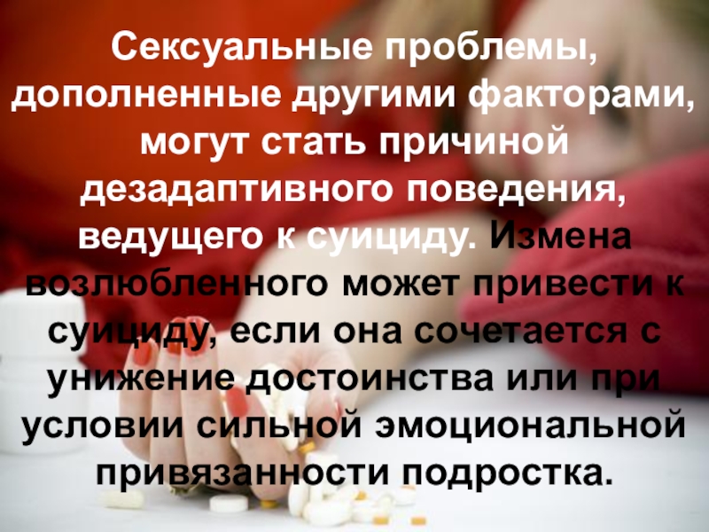 Слайд 159Сексуальные проблемы, дополненные другими факторами, могут стать причиной дезадаптивного поведения, ведущего