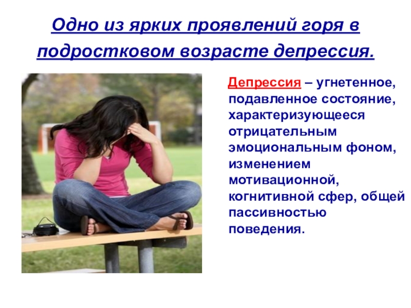 Слайд 23Одно из ярких проявлений горя в подростковом возрасте депрессия.