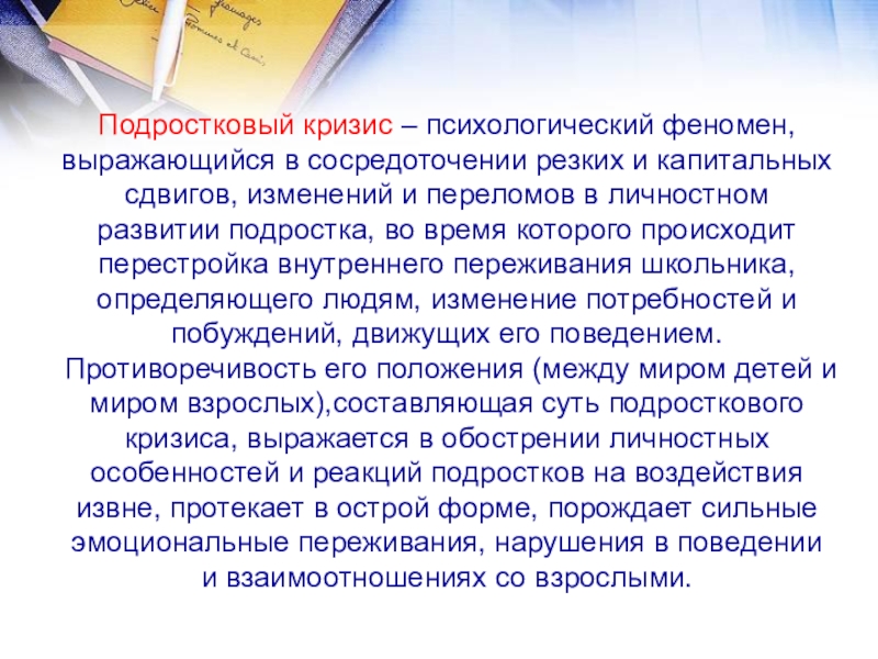 сдвигов, изменений и переломов в личностном развитии подростка, во время которого происходит перестройка внутреннего переживания школьника, определяющего людям, изменение потребностей и побуждений, движущих его поведением. Противоречивость его положения (между миром детей и миром взрослых),составляющая суть подросткового кризиса, выражается в обострении личностных особенностей и реакций подростков на воздействия извне, протекает в острой форме, порождает сильные эмоциональные переживания, нарушения в поведении и взаимоотношениях со взрослыми.