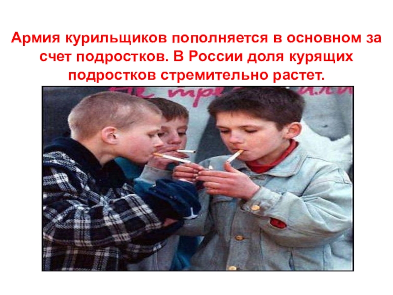 Слайд 134Армия курильщиков пополняется в основном за счет подростков. В России доля