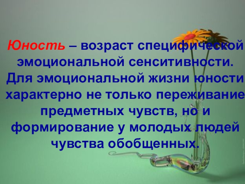 Слайд 21Юность – возраст специфической эмоциональной сенситивности. Для эмоциональной жизни юности характерно