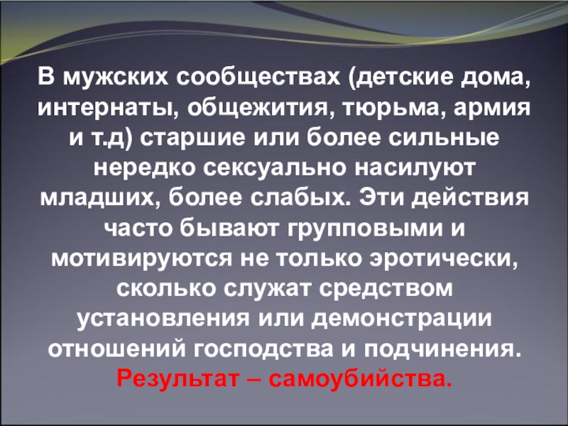 старшие или более сильные нередко сексуально насилуют младших, более слабых. Эти действия часто бывают групповыми и мотивируются не только эротически, сколько служат средством установления или демонстрации отношений господства и подчинения. Результат – самоубийства.