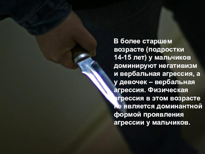 доминируют негативизм и вербальная агрессия, а у девочек – вербальная агрессия. Физическая агрессия в этом возрасте не является доминантной формой проявления агрессии у мальчиков.
