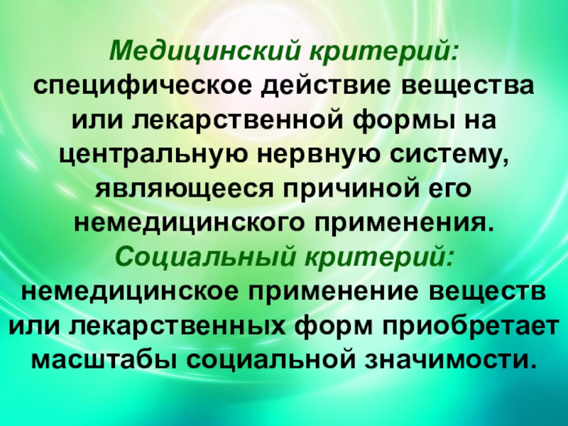 Социальный критерий: немедицинское применение веществ или лекарственных форм приобретает масштабы социальной значимости.