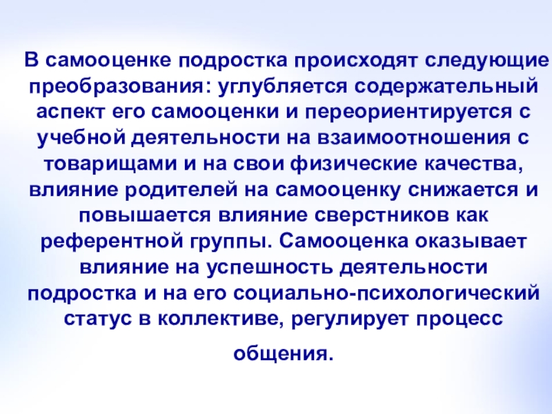 и переориентируется с учебной деятельности на взаимоотношения с товарищами и на свои физические качества, влияние родителей на самооценку снижается и повышается влияние сверстников как референтной группы. Самооценка оказывает влияние на успешность деятельности подростка и на его социально-психологический статус в коллективе, регулирует процесс общения.