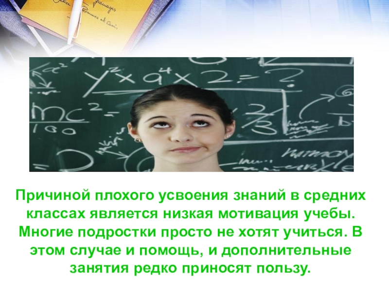 Слайд 54Причиной плохого усвоения знаний в средних классах является низкая мотивация учебы.