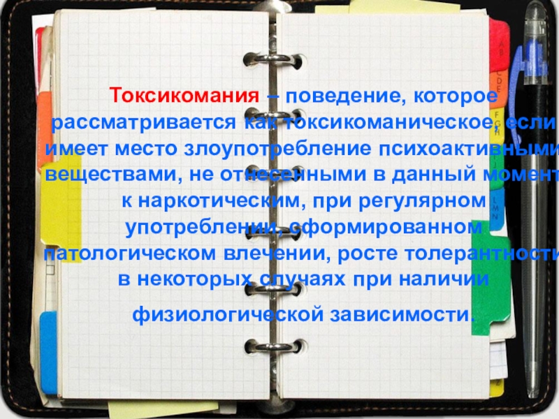 Слайд 140Токсикомания – поведение, которое рассматривается как токсикоманическое, если имеет место злоупотребление