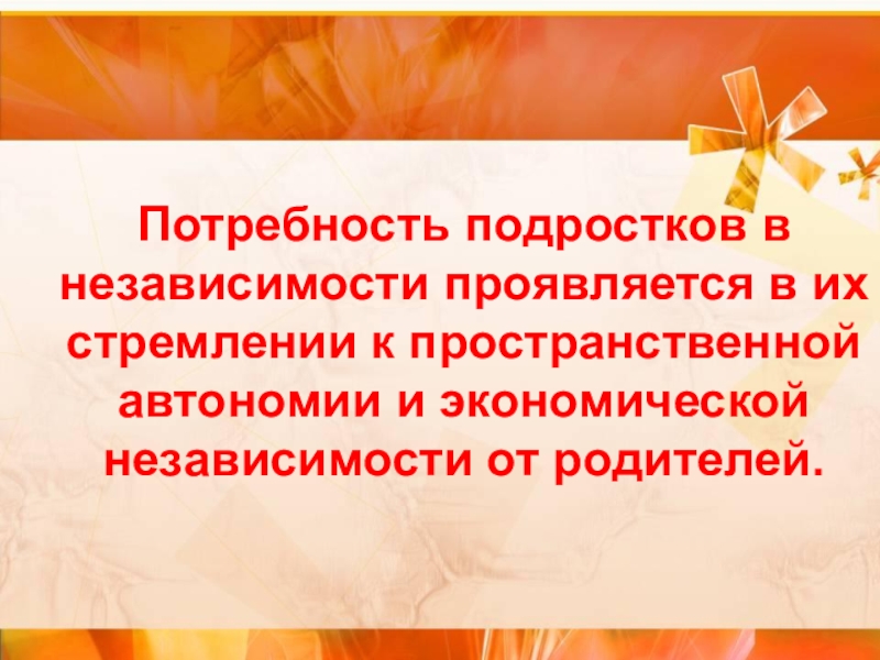 Слайд 27Потребность подростков в независимости проявляется в их стремлении к пространственной автономии