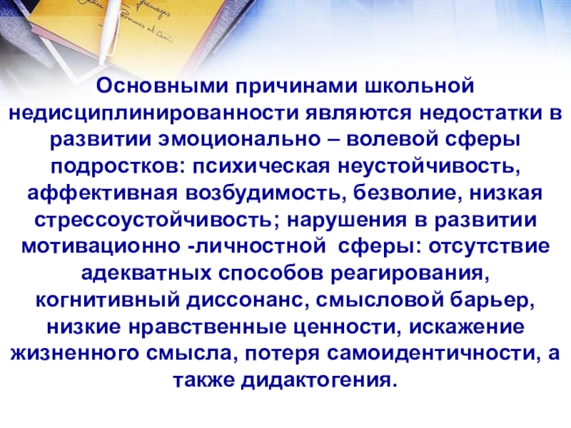 Слайд 55Основными причинами школьной недисциплинированности являются недостатки в развитии эмоционально – волевой