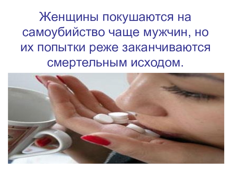 Слайд 151Женщины покушаются на самоубийство чаще мужчин, но их попытки реже заканчиваются