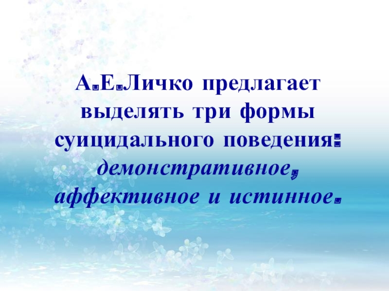 Слайд 154А.Е.Личко предлагает выделять три формы суицидального поведения: демонстративное, аффективное и истинное.