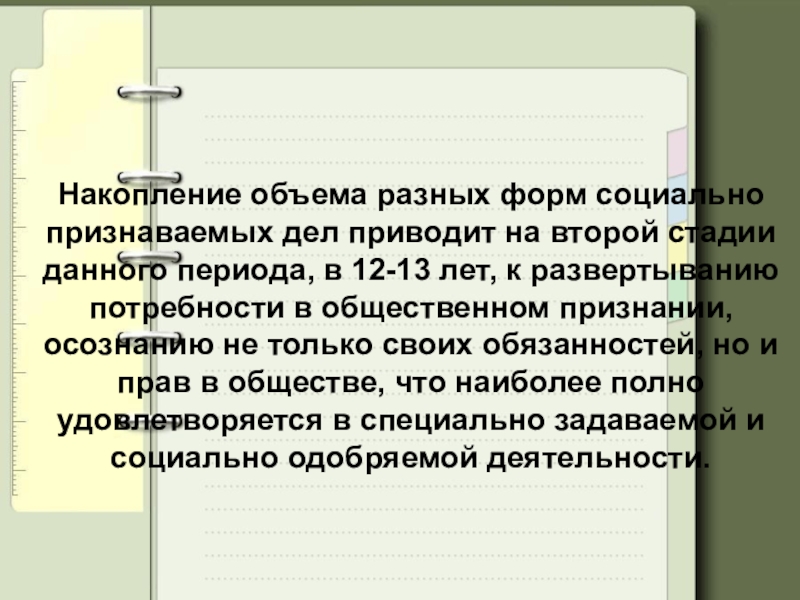 данного периода, в 12-13 лет, к развертыванию потребности в общественном признании, осознанию не только своих обязанностей, но и прав в обществе, что наиболее полно удовлетворяется в специально задаваемой и социально одобряемой деятельности.
