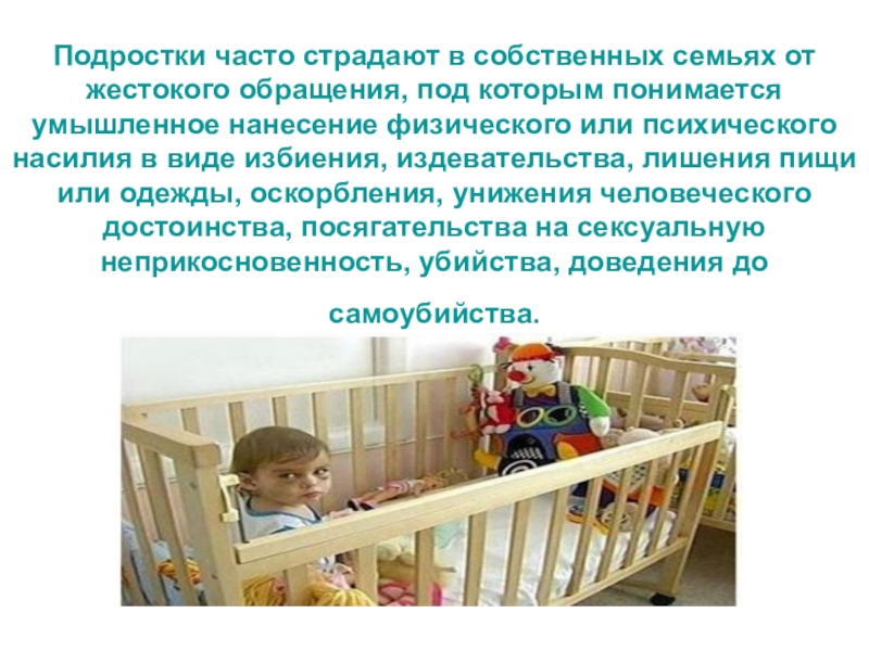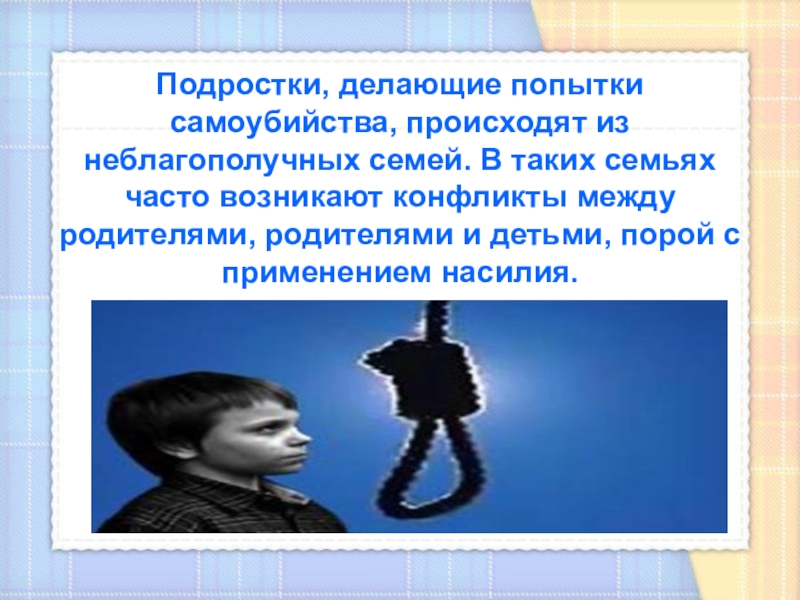 Слайд 158Подростки, делающие попытки самоубийства, происходят из неблагополучных семей. В таких семьях