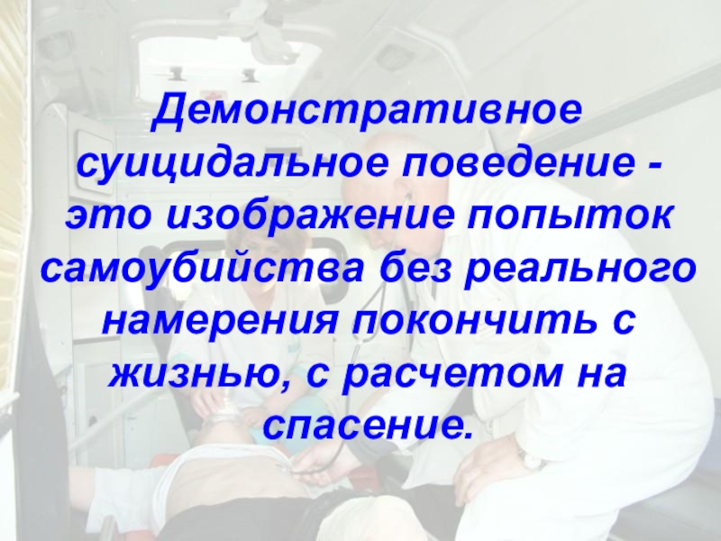 Слайд 155Демонстративное суицидальное поведение - это изображение попыток самоубийства без реального намерения