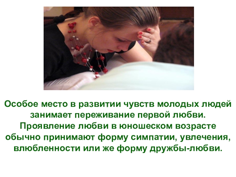 Слайд 22Особое место в развитии чувств молодых людей занимает переживание первой любви.