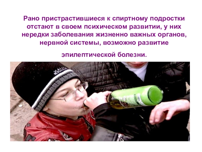 Слайд 141Рано пристрастившиеся к спиртному подростки отстают в своем психическом развитии, у