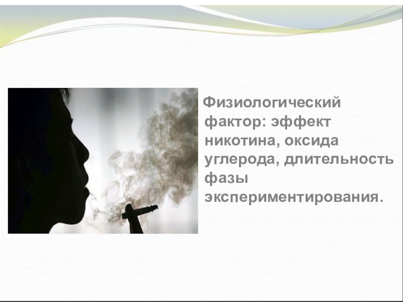Слайд 139 Физиологический фактор: эффект никотина, оксида углерода, длительность фазы экспериментирования.