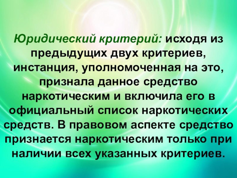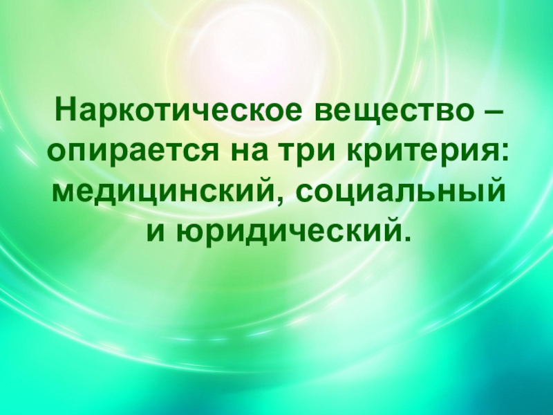 Слайд 142Наркотическое вещество – опирается на три критерия: медицинский, социальный и юридический.