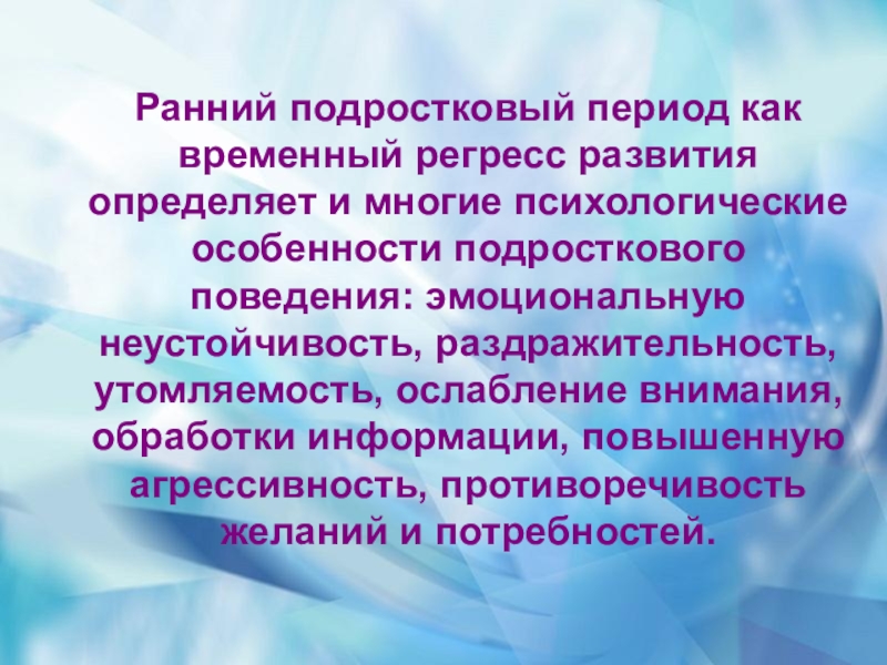 Слайд 8Ранний подростковый период как временный регресс развития определяет и многие психологические