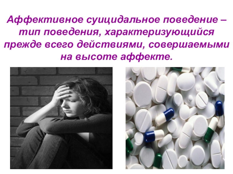 Слайд 156Аффективное суицидальное поведение – тип поведения, характеризующийся прежде всего действиями, совершаемыми