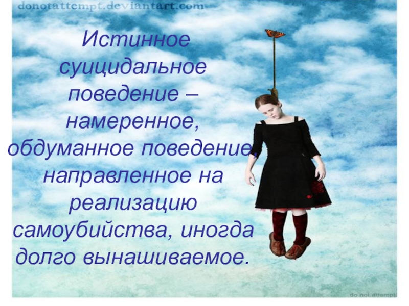 Слайд 157 Истинное суицидальное поведение – намеренное, обдуманное поведение, направленное на реализацию