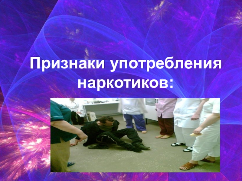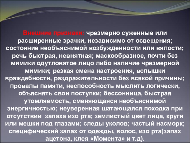 необъяснимой возбужденности или вялости; речь быстрая, невнятная; маскообразное, почти без мимики одутловатое лицо либо наличие чрезмерной мимики; резкая смена настроения, вспышки враждебности, раздражительности без всякой причины; провалы памяти, неспособность мыслить логически, объяснять свои поступки; бессонница, быстрая утомляемость, сменяющаяся необъяснимой энергичностью; неуверенная шатающаяся походка при отсутствии запаха изо рта; землистый цвет лица, круги или мешки под глазами; следы уколов; частый насморк; специфический запах от одежды, волос, изо рта(запах ацетона, клея «Момента» и т.д).