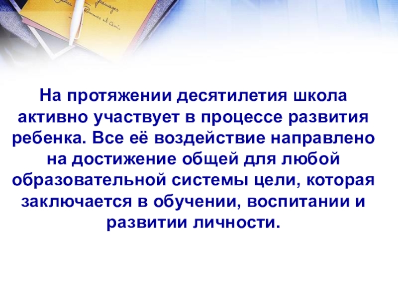 Слайд 44На протяжении десятилетия школа активно участвует в процессе развития ребенка. Все