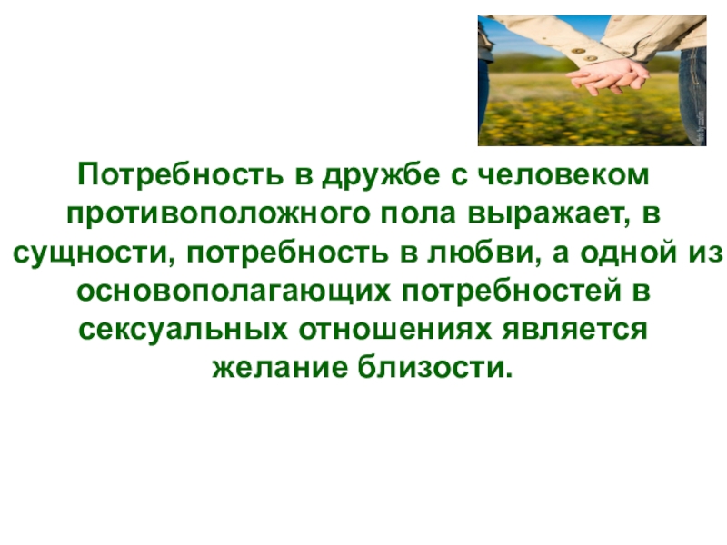Слайд 118Потребность в дружбе с человеком противоположного пола выражает, в сущности, потребность