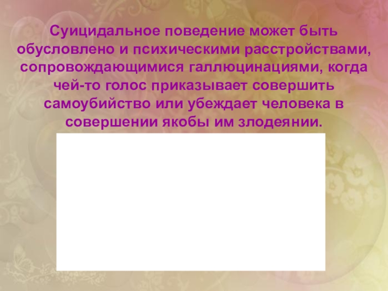 Слайд 163Суицидальное поведение может быть обусловлено и психическими расстройствами, сопровождающимися галлюцинациями, когда