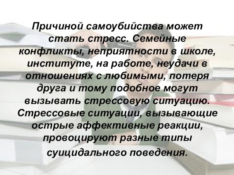 Слайд 162Причиной самоубийства может стать стресс. Семейные конфликты, неприятности в школе, институте,