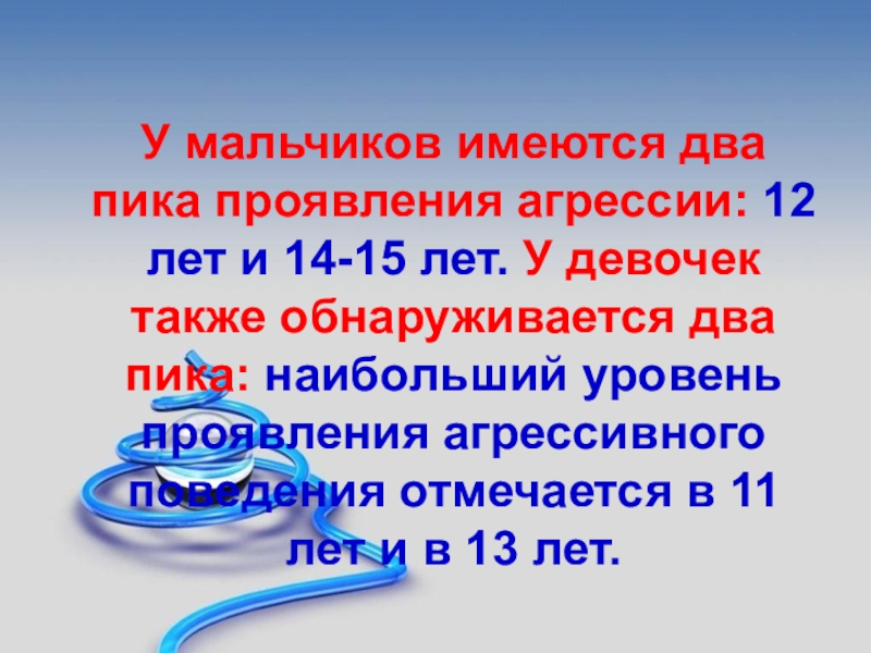 Слайд 123У мальчиков имеются два пика проявления агрессии: 12 лет и 14-15