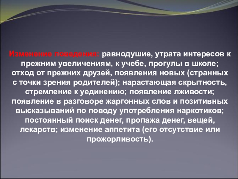 в школе; отход от прежних друзей, появления новых (странных с точки зрения родителей); нарастающая скрытность, стремление к уединению; появление лживости; появление в разговоре жаргонных слов и позитивных высказываний по поводу употребления наркотиков; постоянный поиск денег, пропажа денег, вещей, лекарств; изменение аппетита (его отсутствие или прожорливость).