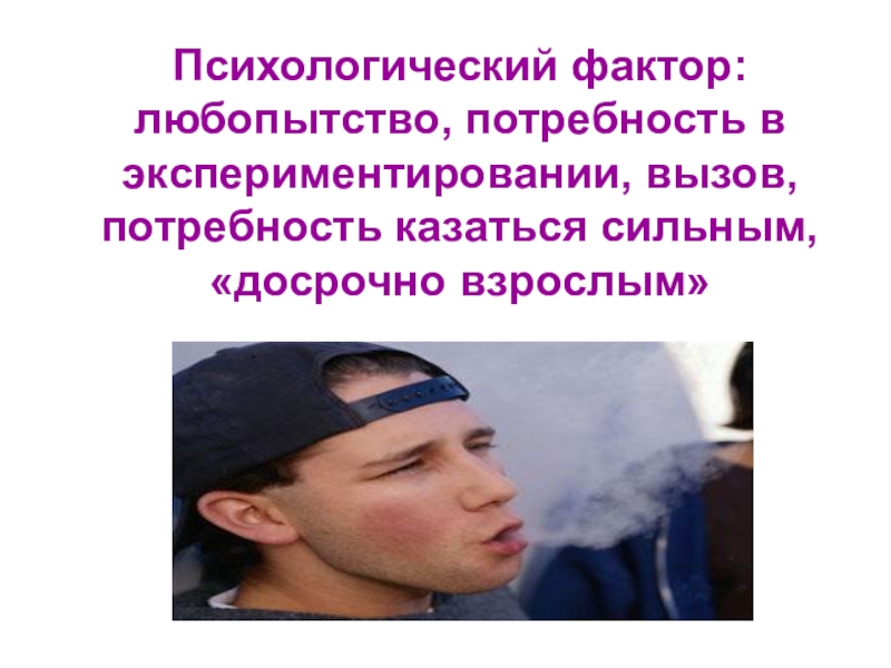 Слайд 137Психологический фактор: любопытство, потребность в экспериментировании, вызов, потребность казаться сильным, «досрочно
