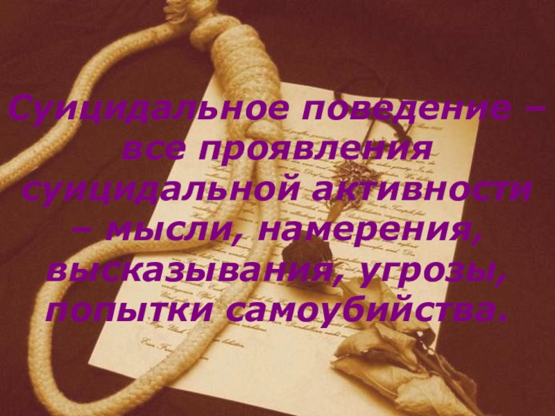 Слайд 150Суицидальное поведение – все проявления суицидальной активности – мысли, намерения, высказывания,