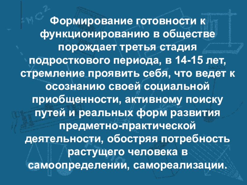 Слайд 42Формирование готовности к функционированию в обществе порождает третья стадия подросткового периода,