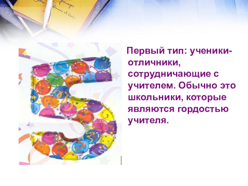 Слайд 47 Первый тип: ученики-отличники, сотрудничающие с учителем. Обычно это школьники,