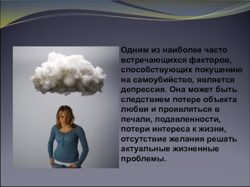 самоубийство, является депрессия. Она может быть следствием потере объекта любви и проявляться в печали, подавленности, потери интереса к жизни, отсутствие желания решать актуальные жизненные проблемы.