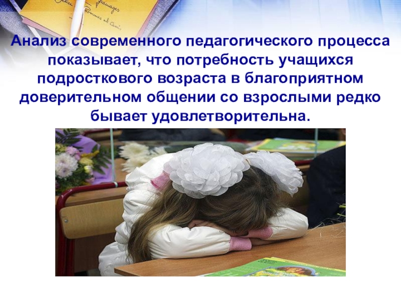 Слайд 45Анализ современного педагогического процесса показывает, что потребность учащихся подросткового возраста в