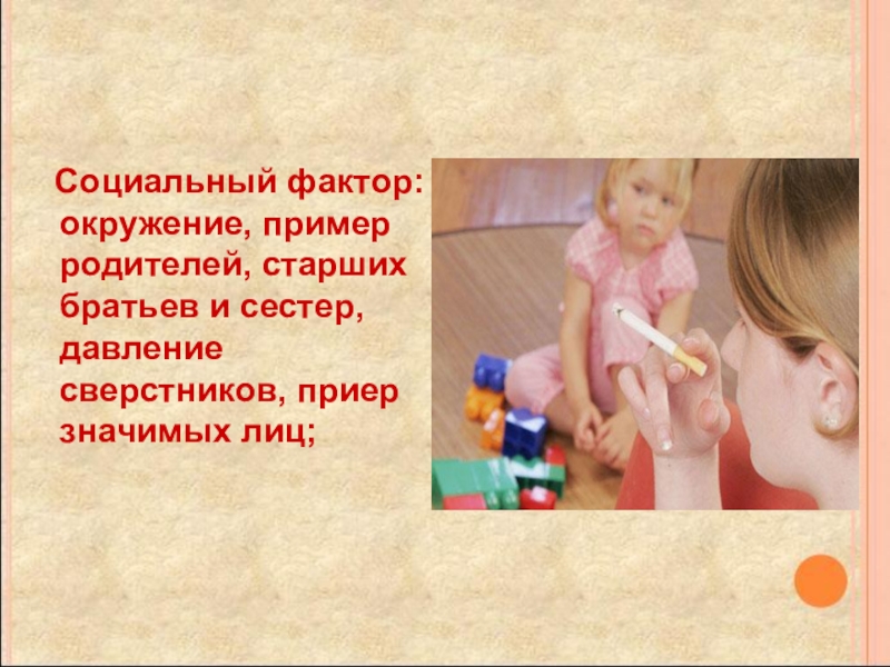 Слайд 138 Социальный фактор: окружение, пример родителей, старших братьев и сестер,