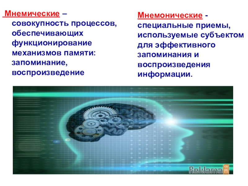 Слайд 16 Мнемические – совокупность процессов, обеспечивающих функционирование механизмов памяти: запоминание, воспроизведение