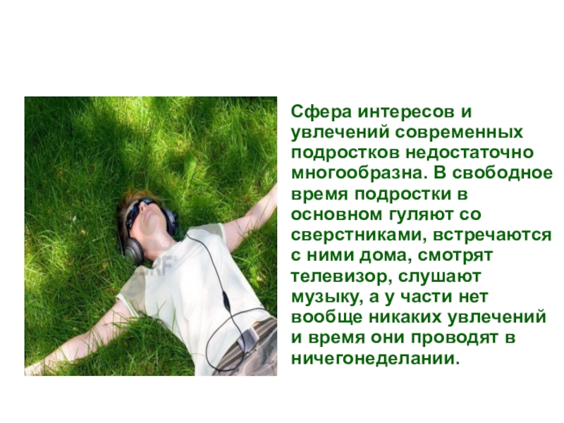 Слайд 29 Сфера интересов и увлечений современных подростков недостаточно многообразна. В