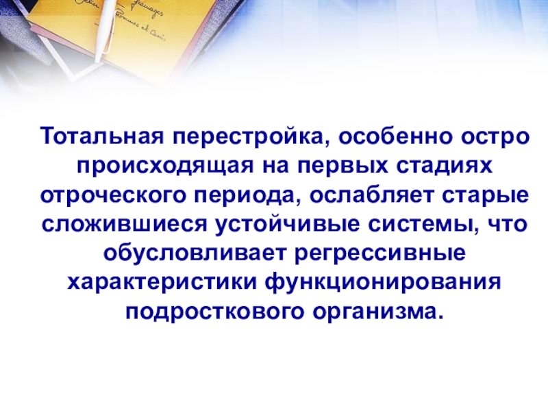 Слайд 7Тотальная перестройка, особенно остро происходящая на первых стадиях отроческого периода, ослабляет