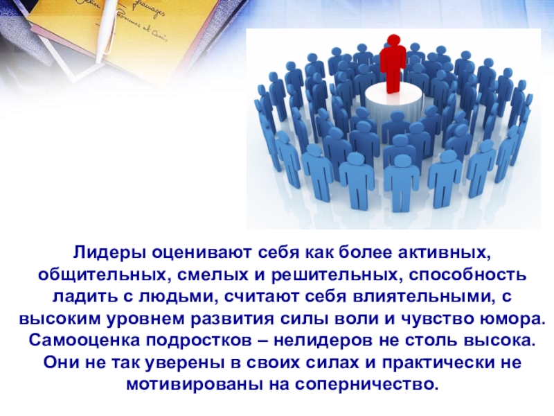 ладить с людьми, считают себя влиятельными, с высоким уровнем развития силы воли и чувство юмора. Самооценка подростков – нелидеров не столь высока. Они не так уверены в своих силах и практически не мотивированы на соперничество.