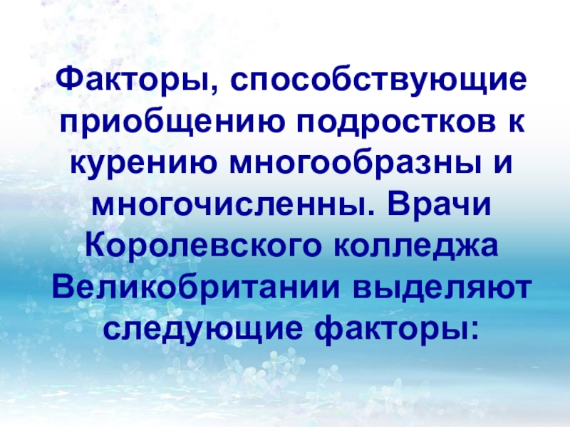 Слайд 136Факторы, способствующие приобщению подростков к курению многообразны и многочисленны. Врачи Королевского