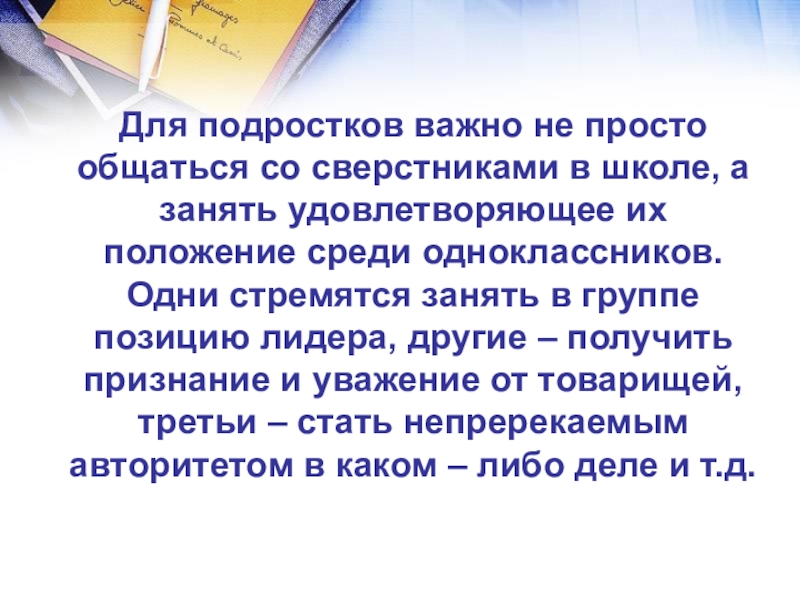 занять удовлетворяющее их положение среди одноклассников. Одни стремятся занять в группе позицию лидера, другие – получить признание и уважение от товарищей, третьи – стать непререкаемым авторитетом в каком – либо деле и т.д.